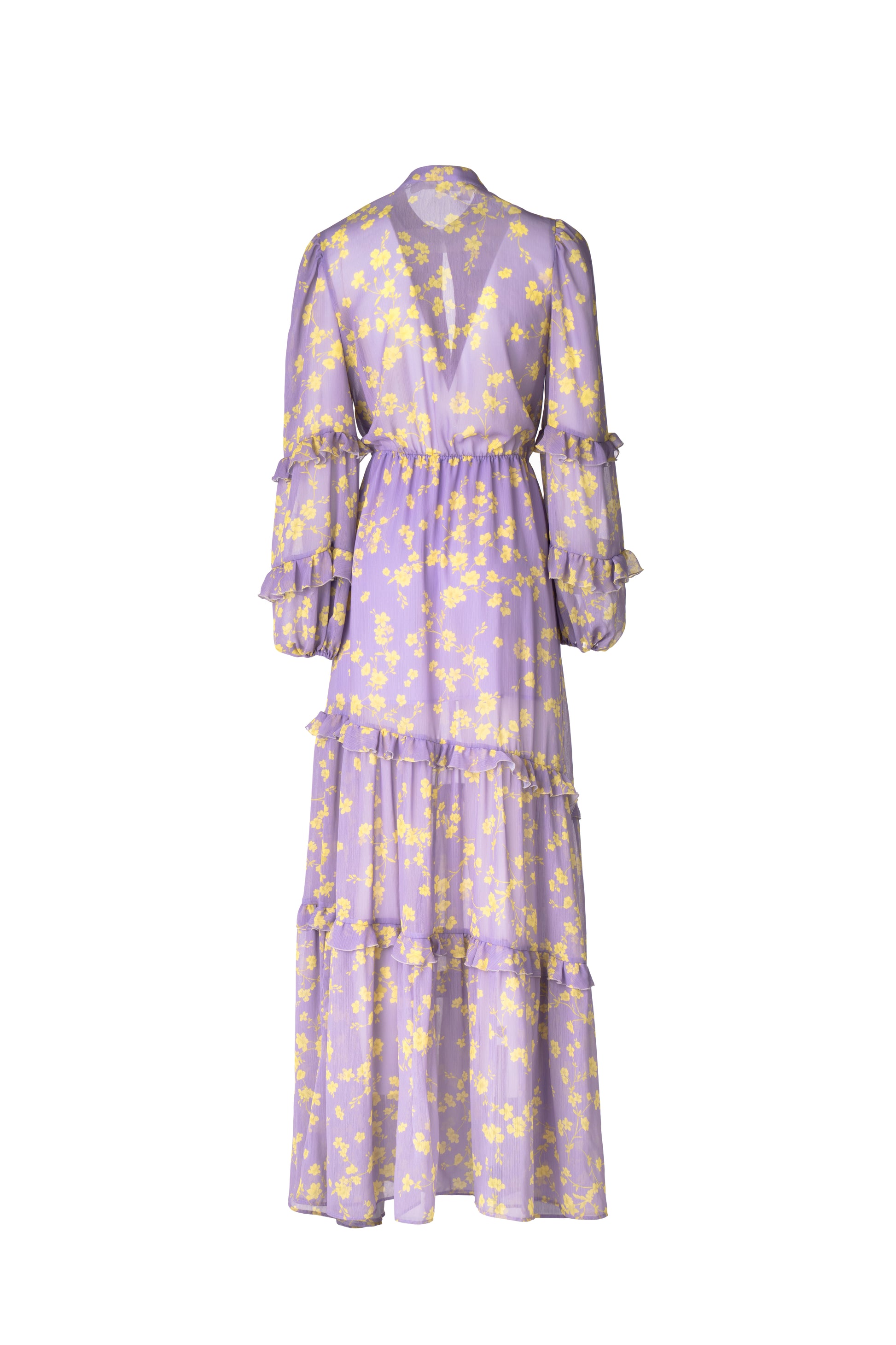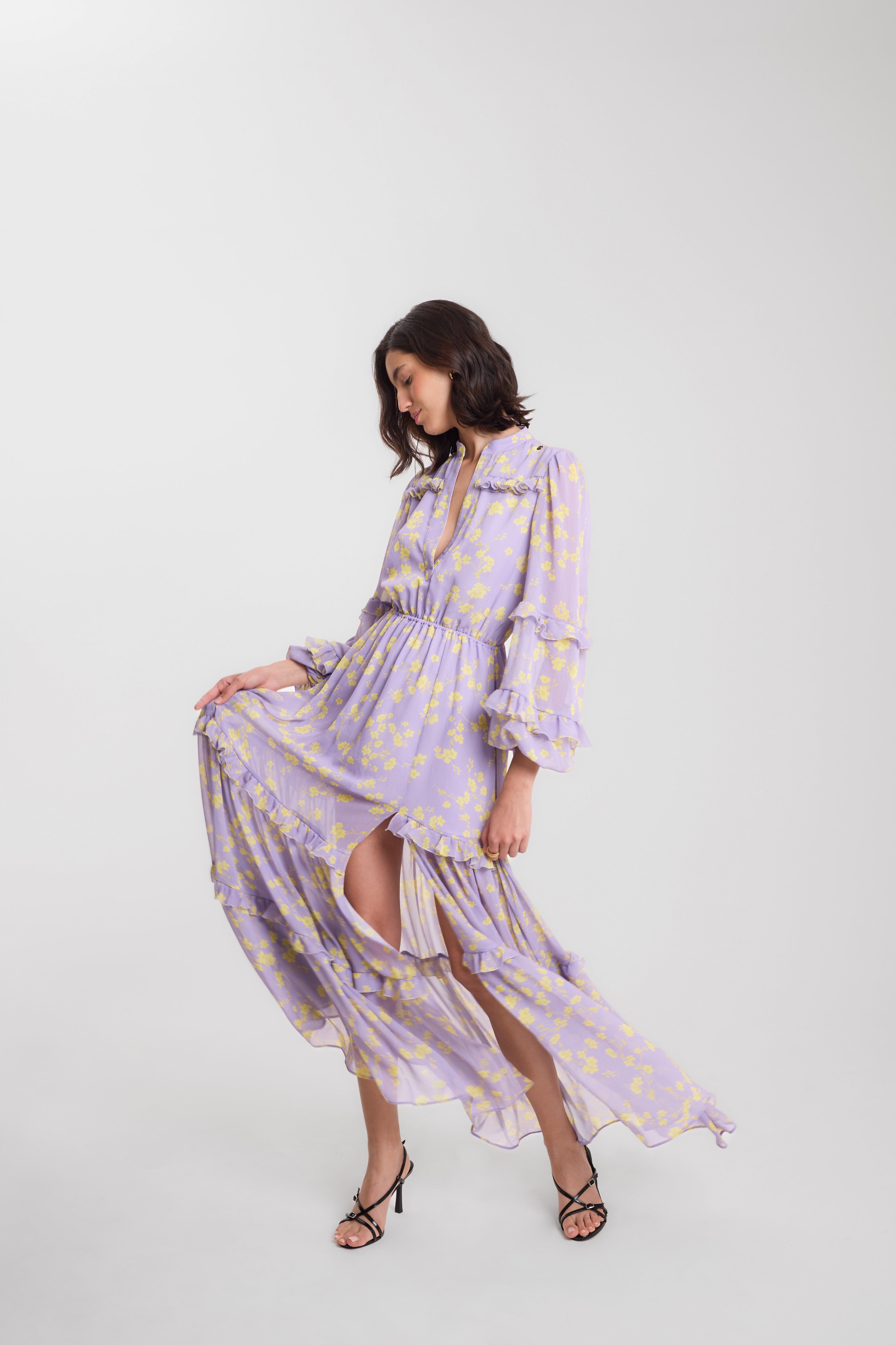 Crepe pleated dress with open sleeves and back sensual neckline.